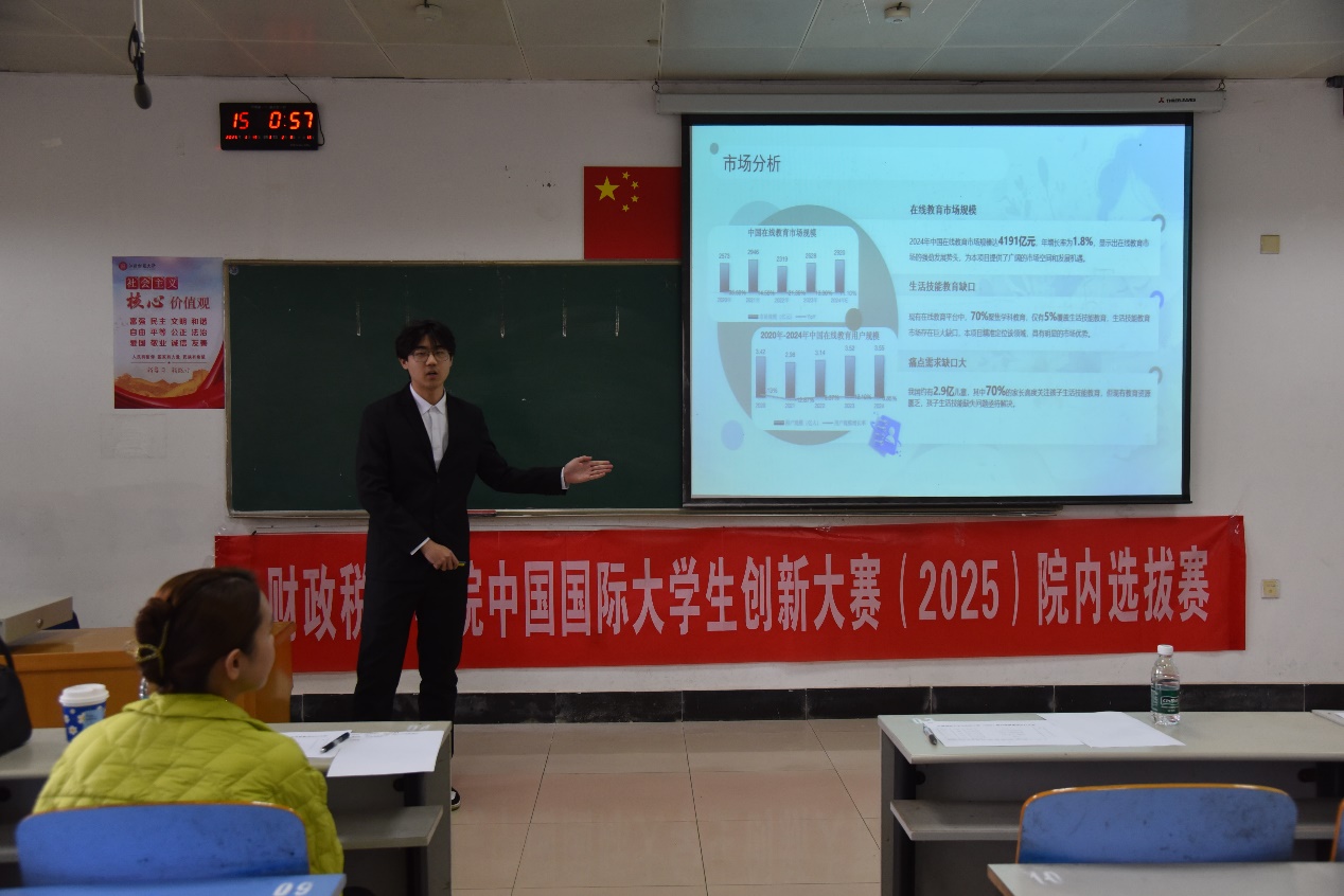 3月19日,财政税务学院在5122教室成功举办了中国国际大学生创新大赛院赛。本次大赛吸引了众多学生团队踊跃参与,参赛项目涵盖主赛道与红旅赛道,聚焦金融科技、教育创新、文化传承、绿色经济等前沿领域。学院团委书记李婷婷、专职辅导员蔡晨慧和李楠担任评委,现场气氛热烈,充分展现了财税学子锐意创新的精神风貌。