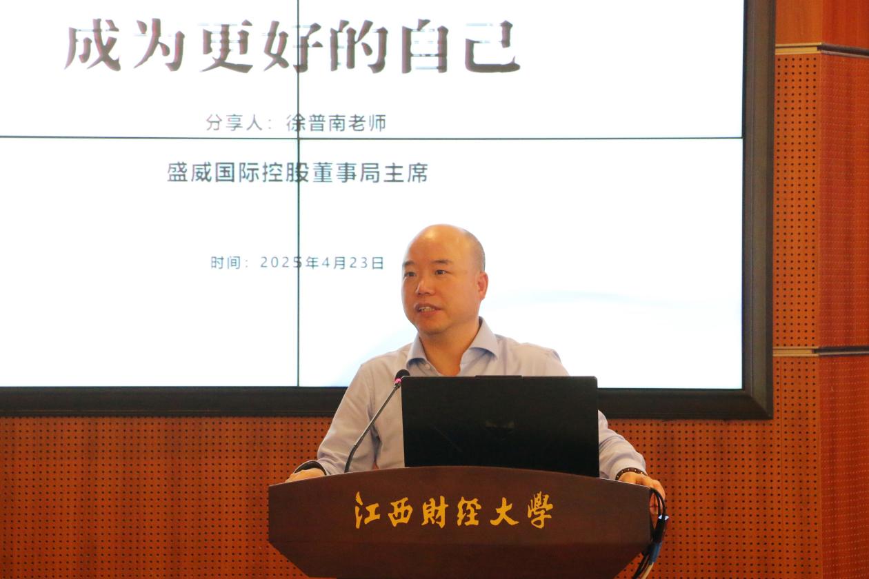 4月23日下午14:20在图文信息大楼一楼2号报告厅,盛威国际控股(中国)董事局主席徐普南以“成为更好的自己”为主题,向大学生讲述个人成长与企业发展的价值观根基。本次讲座由校党委常委、副校长李春根主持。深圳市格曼电子商务有限公司总经理李永刚、盛威国际控股(中国)有限公司常务副总裁邱敏、盛威国际战略副总裁代风云、盛威国际产业园发展委员会主任张玉彬、江西财经大学校友联络服务中心主任夏贤锋、财政税务学院党委书记段远鸿、财政税务学院副院长舒成及企业随行人员出席参与本次讲座。