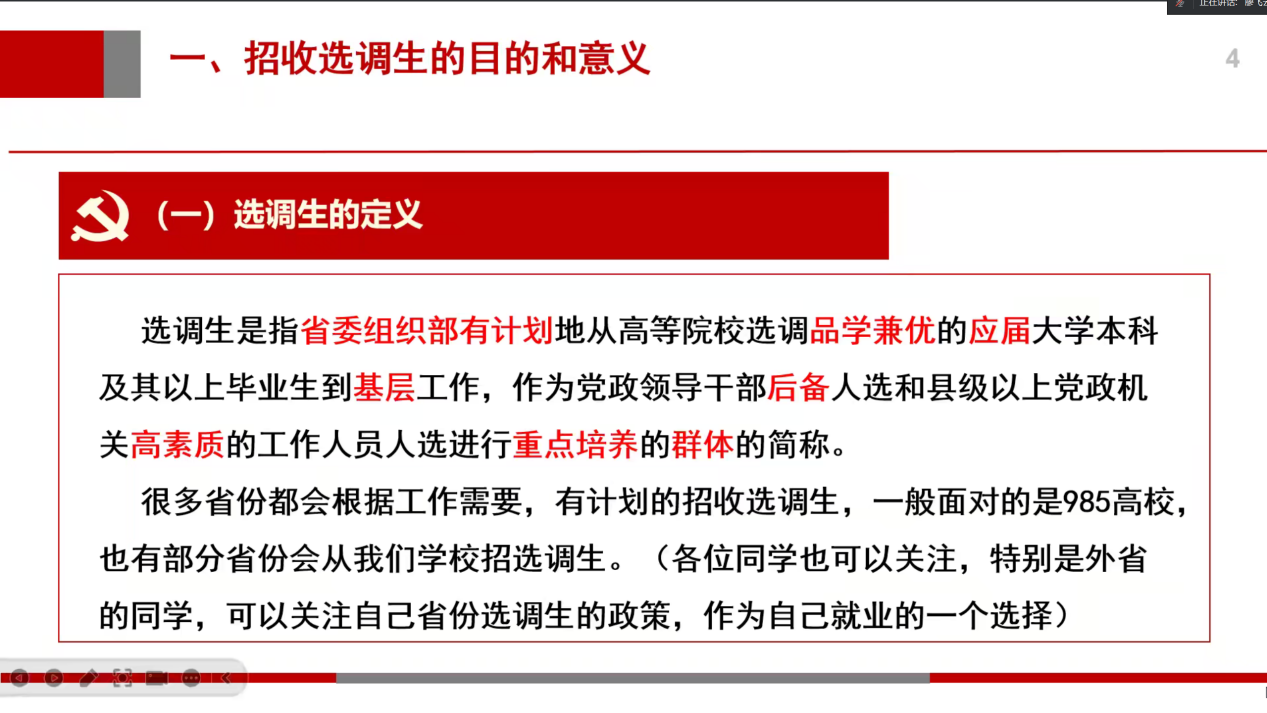 讲座伊始,廖云飞老师首先强调了选调生政策的重要性。他指出,江西省的选调生政策旨在选拔具备高度政治素质、优秀学业成绩和较强组织协调能力的年轻干部,此外,廖云飞老师详细介绍了江西省选调生报考的具体要求。
