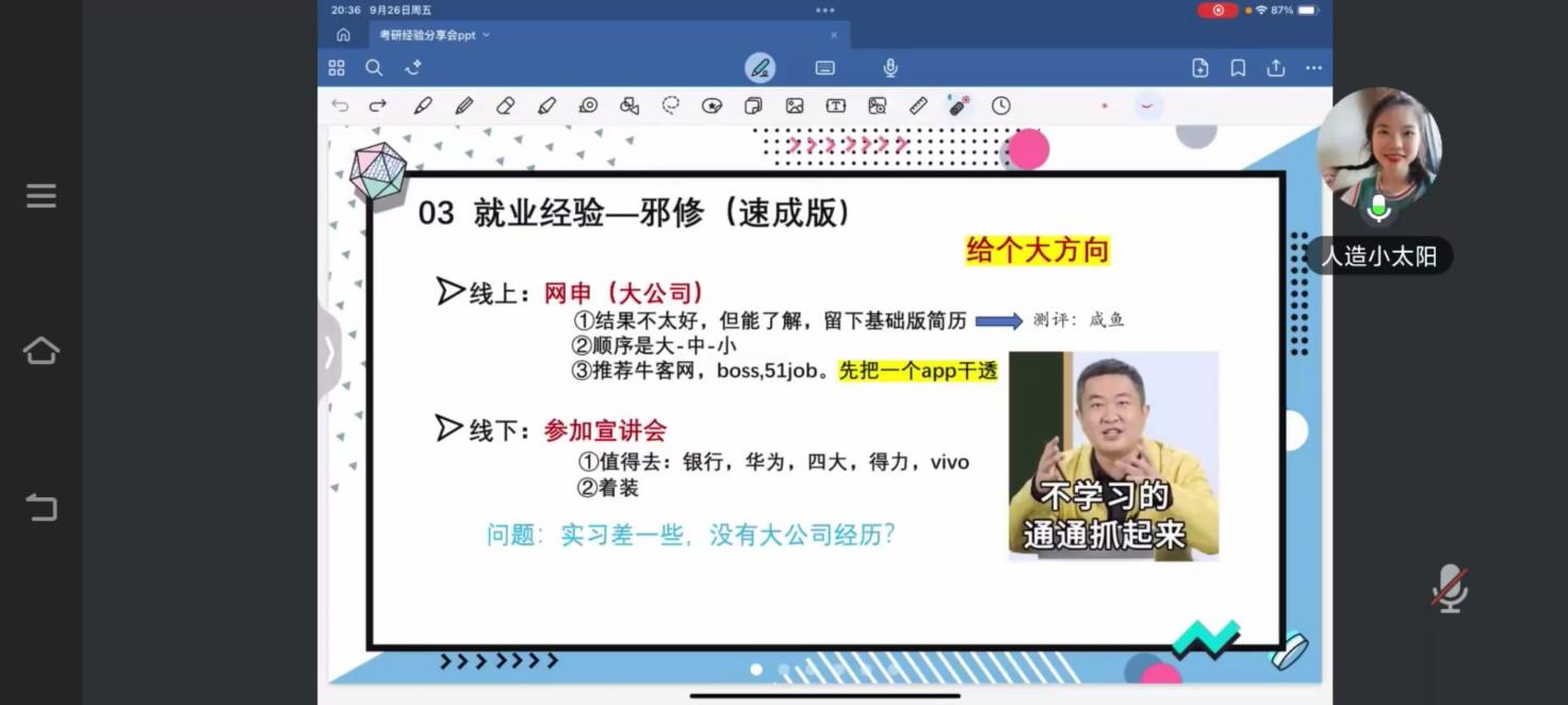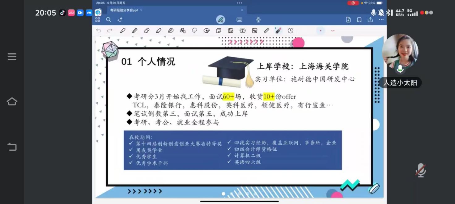 财政税务学院联合“职YES”职业生涯咨询工作室,分别在9月26日与27日晚八点,举办了《毕业生主题班会:考研战场和“世界五百强”职场全垒打》线上主题班会。此次班会邀请了本校21级税收学优秀毕业生黄丹主讲,为毕业生们带来了干货满满的经验分享。
