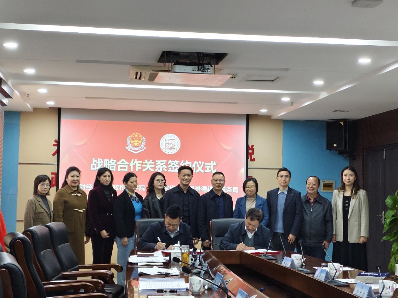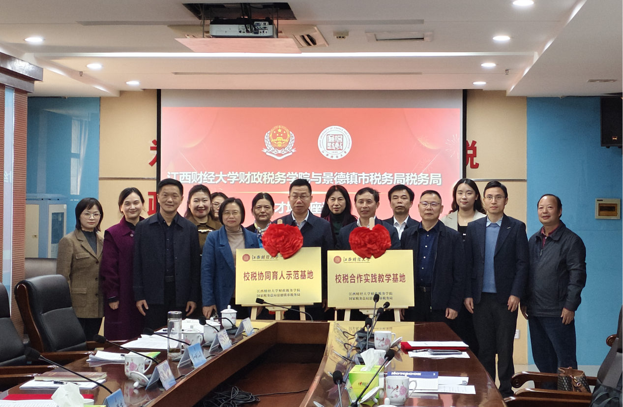 12月11日,江西财经大学财政税务学院与国家税务总局景德镇市税务局正式签署战略合作协议,并共同为“校税合作实践教学基地”和“校税协同育人示范基地”揭牌。景德镇市税务局党委书记、局长温群茂,党委委员、副局长冯晔,江西财经大学财政税务学院党委书记段远鸿,财税研究中心主任席卫群以及其他相关人员出席了会议。此次合作标志着双方在人才培养、科研创新与实践应用的深度融合方面迈出了关键一步,其核心目的在于共同服务税收现代化与国家治理能力的提升,为景德镇的全面崛起和江西的高质量发展注入税务动力。双方将聚焦税收专业人才培养,通过共建实践教学基地、协同开发课程体系、联合开展课题研究等方式,打造“理论+实践”双轮驱动的人才培育模式,为税务系统输送兼具专业素养与实战能力的复合型人才。