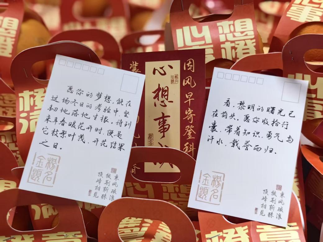 本次考研助力包兼具实用性与精神激励,内容丰富而周全。包内备好了中性笔、涂卡笔、橡皮、直尺等全套应试文具,为高效备考提供有力支撑。同时,学院格外暖心地准备的印有“研途璀璨,一战成硕”等祝福的定制书签与贺卡,学校准备的印有“心想事‘橙’”“‘橙’意满满”祝福语的橙子,助力同学们以饱满状态迎战考场。
