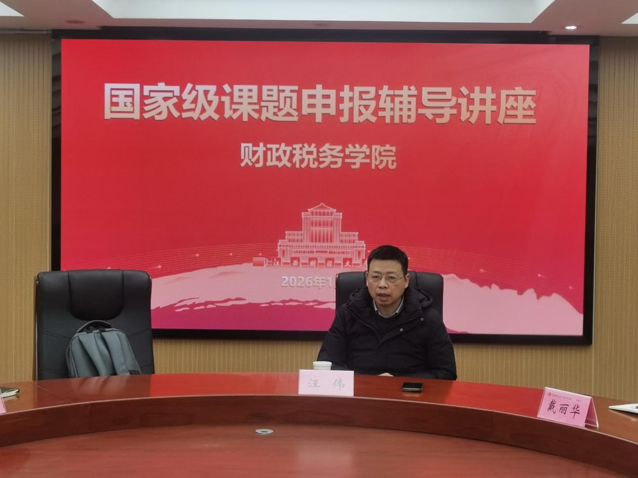 为扎实推进国家级科研项目申报工作,提升课题论证质量与竞争力,2026年1月29日财政税务学院邀请了上海财经大学汪伟教授进行国家级课题申报辅导。汪伟教授作了题为“国家社科基金申请技巧与体会”的学术讲座,学院拟申报国家社科、国家自科及教育部人文社科年度项目的教师、科研骨干以及博士生等20余人参与了交流,此次学术讲座由学院行政牵头负责人舒成教授主持。