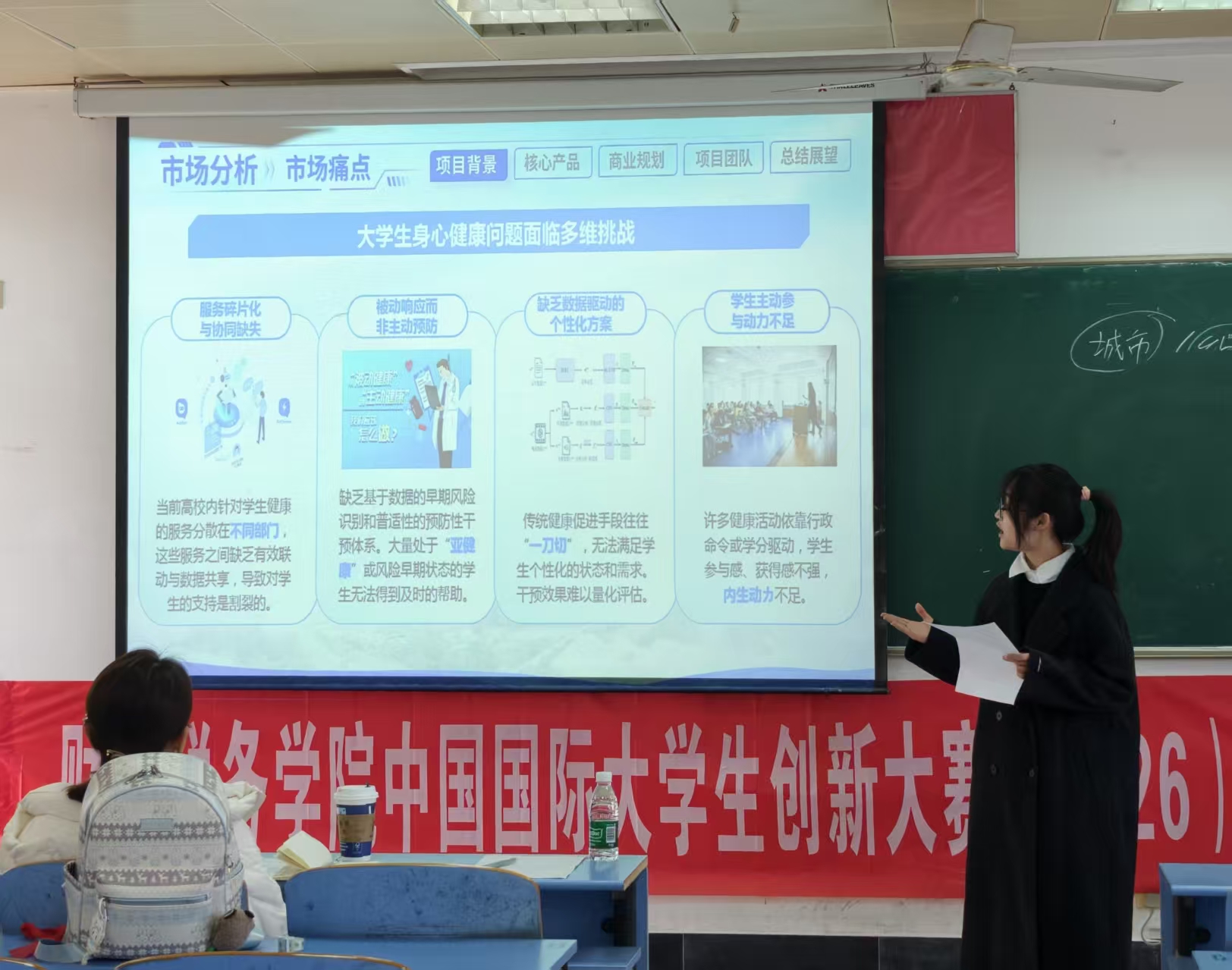 比赛现场,各参赛团队精神饱满,通过PPT演示与现场答辩相结合的方式,全面阐述了参赛项目的创新亮点、商业模式与发展前景。